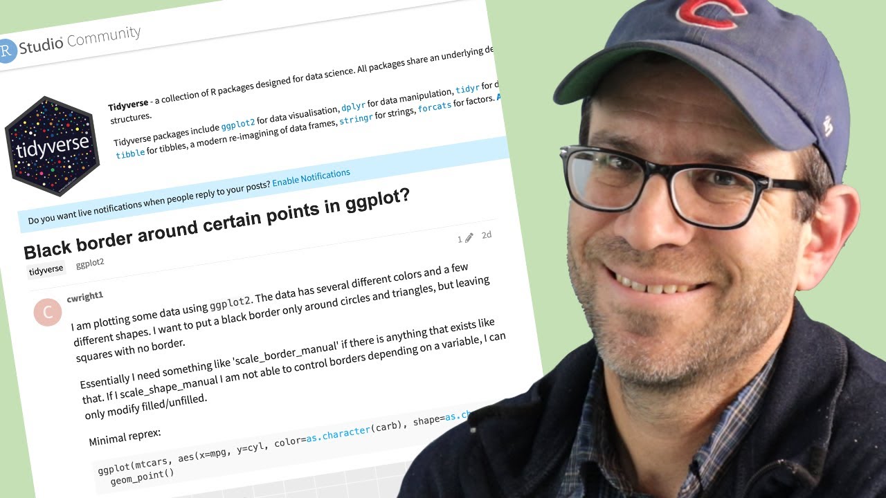 Thanks for posting your question, this turned out to be a fun challenge! A couple of high level points. First, plotting symbols 21 through 25 allow you to set the interior color with the fill aesthetic and the border with the color aesthetic. I mapped the carb variable to the fill aesthetic. Sadly, although you can change the thickness of the border with the stroke aesthetic, there is no scale_stroke_manual function. I had hoped to map gear to stroke and set it equal to zero for 5 cylinder cars. Instead, my strategy was to map the number of gears to the color aesthetic. Then using scale_color_manual, I used the alpha argument of rgb to make the border of the squares transparent. Because that made the squares appear a bit smaller, I bumped up their size a smidge. Finally, you'll notice that I modified the appearance of the legends to make it clear that a circle in the shape legend wasn't the same as a circle in the fill legend.
