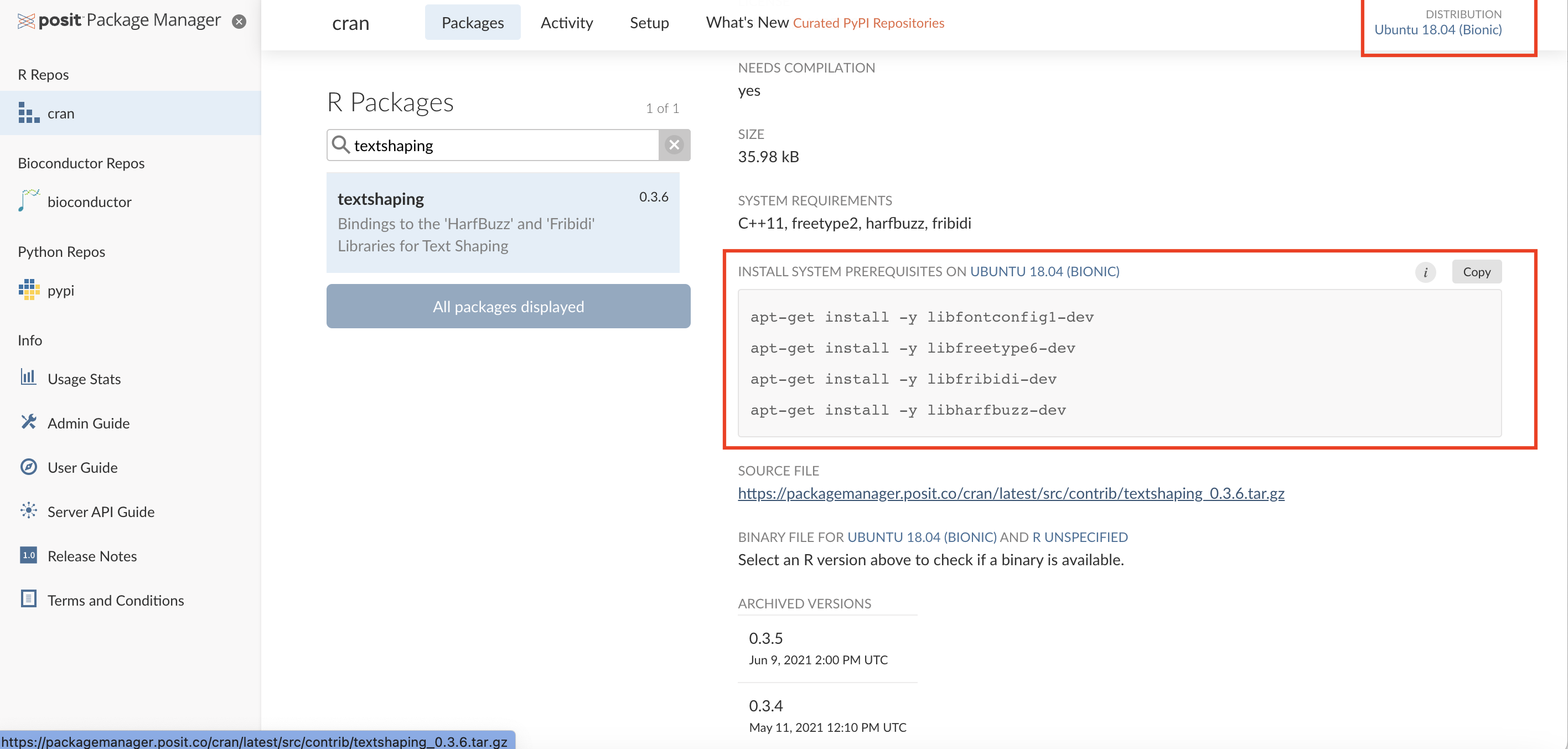 There is also a couple of additional possibilities how you can figure out system dependencies more programmatically via CLI only (e.g. GitHub - r-lib/pak: A fresh approach to package installation) but those CLI tools come with their own set of complexities (see an example on how pak could be used in install arrow from posit package manager binary in Ubuntu - #3 by Gabor)