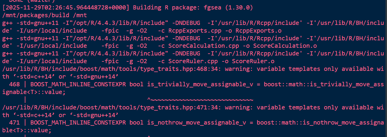 During deployment, I get: Error building fgsea (1.30.0). Build exited with non-zero status: 1