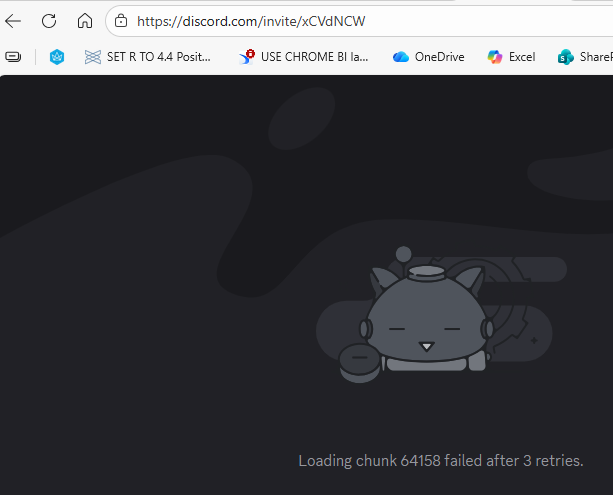 Getting errors when I try to use the Discord link that was advertised during yesterday's Data Science Hangout ie pos.it/discord . Today on my work laptop, on Edge, it displays a message saying "Loading chunk 64158 failed after 3 retries". Yesterday (on the same machine) it was the same message but a slightly lower number, under 60,000.