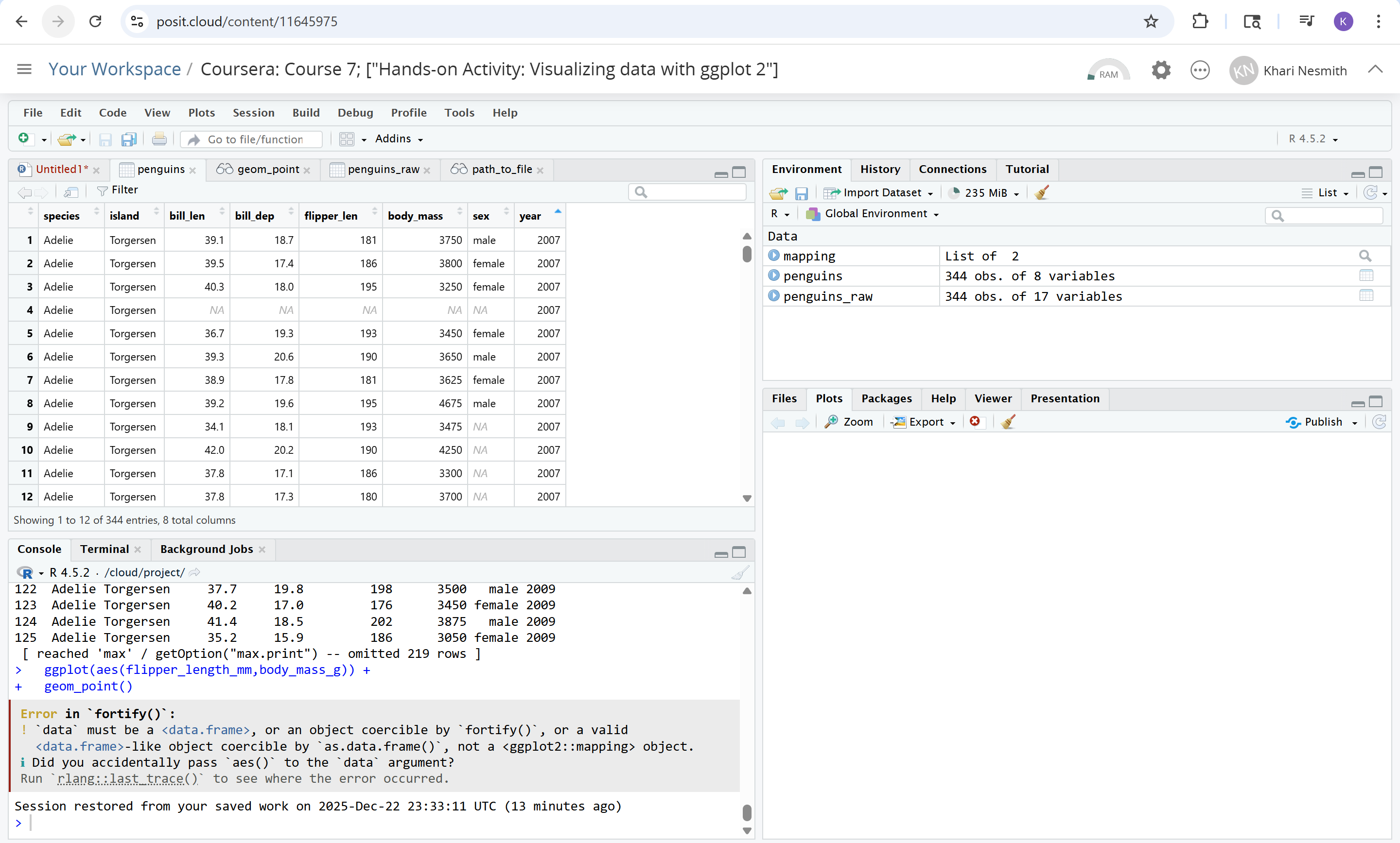 I encountered an error while running the code "ggplot(data=penguins + geom_point(mapping=aes(x=flipper_length_mm, y=body_mass_g))" to create a data vis.