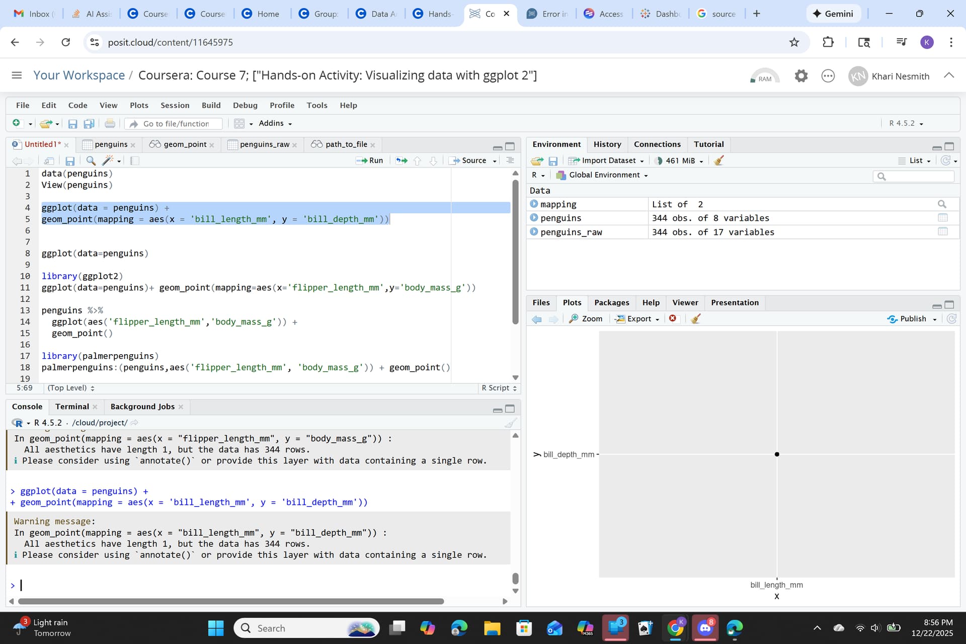 I tried out the code "ggplot(data = penguins) + geom_point = aes(x = 'bill_length, y = 'bill_depth_mm')), and it finally showed a scatterplot. However it only show one dot in the middle of the chart.
