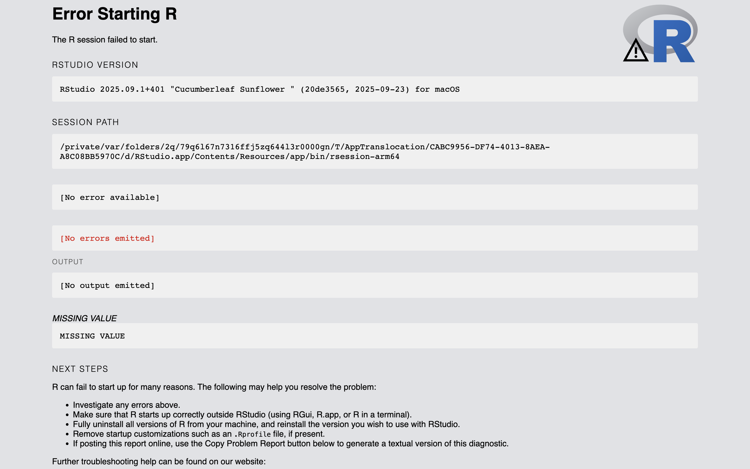 I’m having trouble opening RStudio on my MacBook Air. Every time I try to launch it, I get an error message saying the “R session failed to start” or something about a path mismatch.