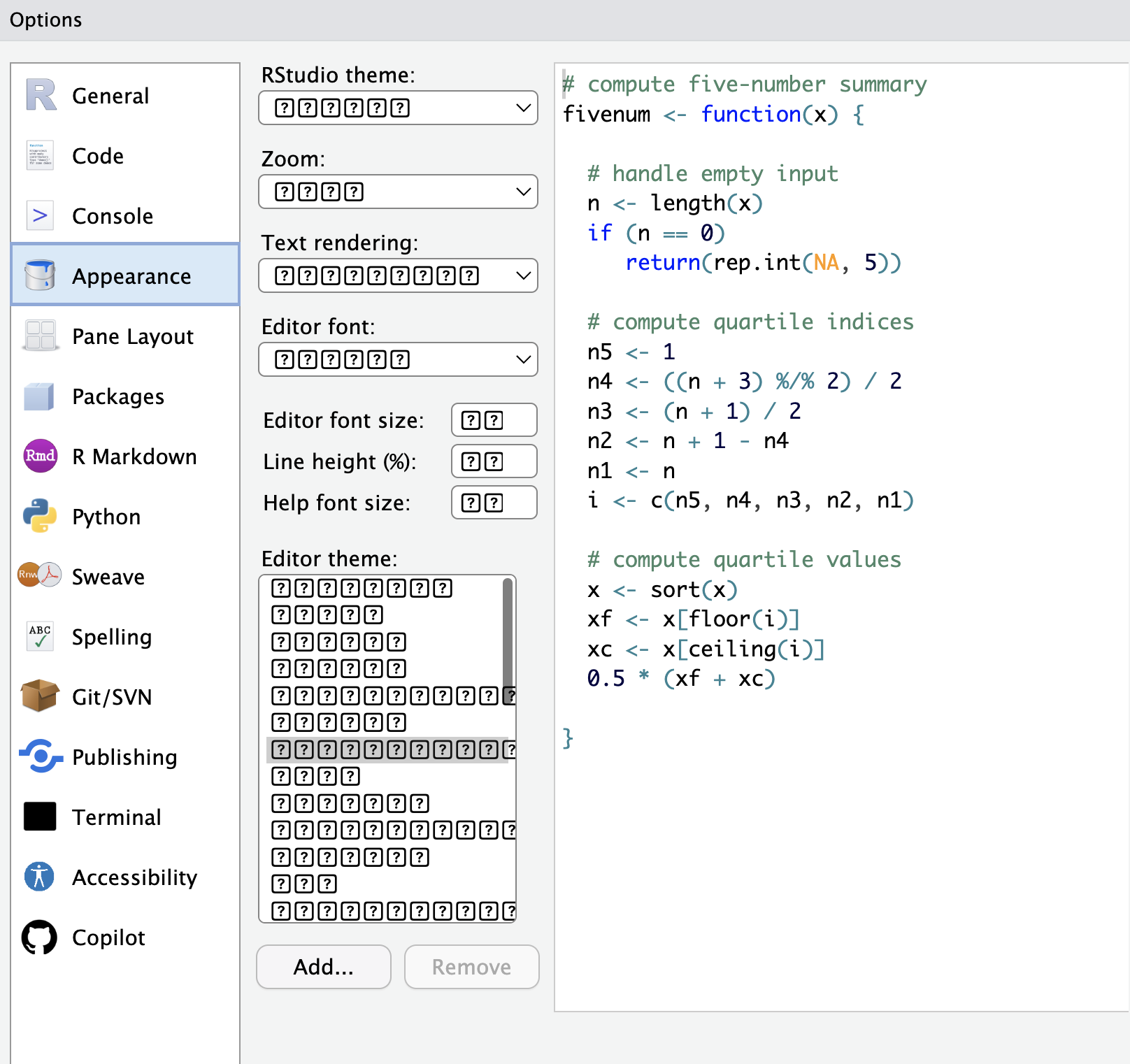 When I launch Rstudio, the splash screen has question marks (?) all over it.