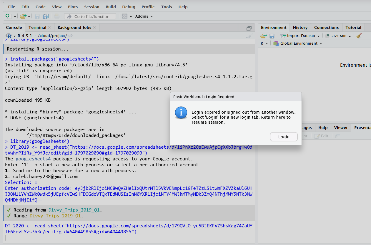 I've been trying to do my first real project in Rstudio, but every time I load the data, I stop to looks something up and it logs me out. Then when I come back in the project is blank. I have to re-install all of the packages and the data, and then it just happens again. I thought maybe it was because I've been using my work computer in my downtime and then my home computer, but I closed Rstudio at work and it is still happening. I closed all other posit tabs, and it is still happening. So basically Rstudio is simply not working, and I don't know why.