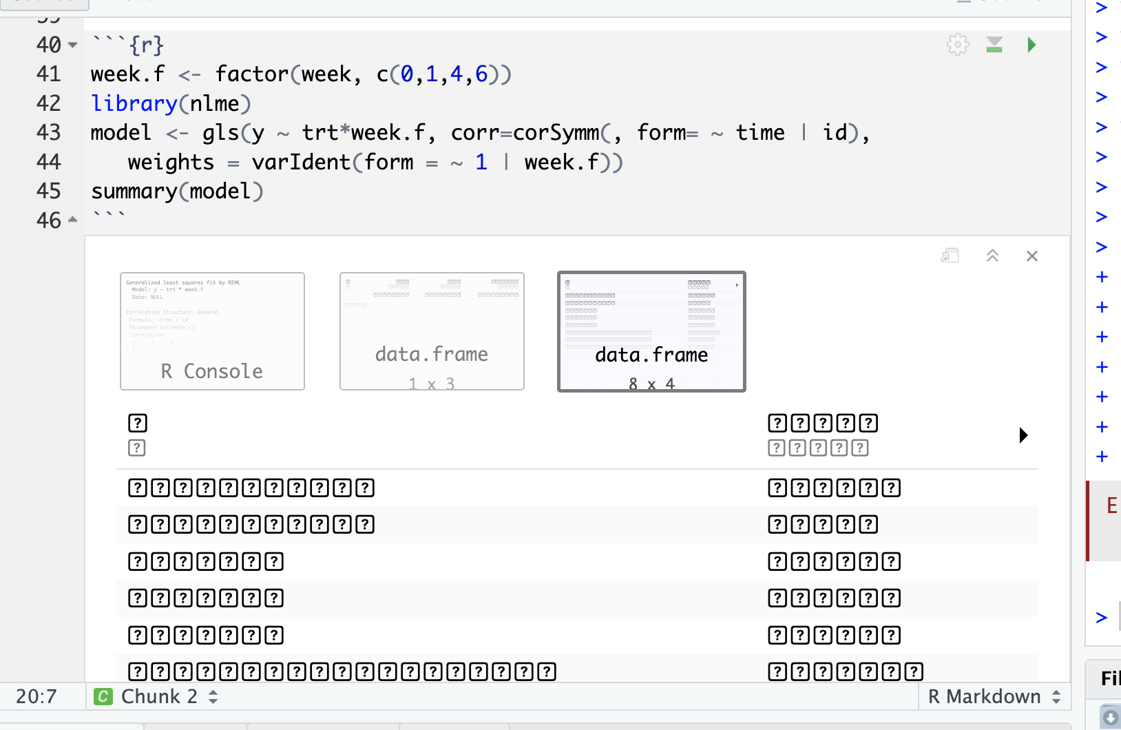 I need help with this. Anytime I import a data to rmarkdown and I ran it, it comes as question marks. I have to run it again in the console to see the actual values.
