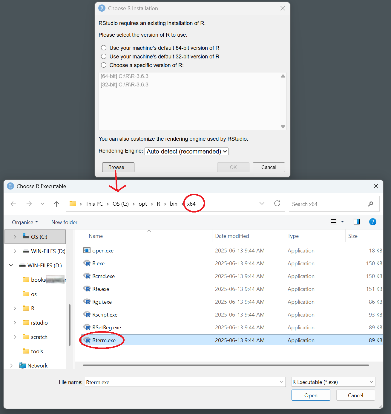Then try browsing to the location you have R, specifically select RTerm.exe inside the x64 folder. If that doesn't work then something else is going on.