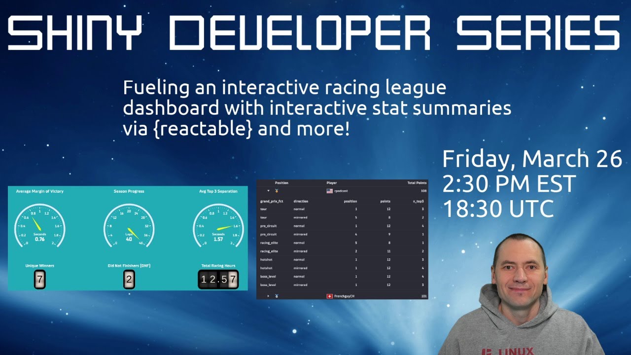 Repo: GitHub - rpodcast/hotshots.dashboard: A Shiny-powered dashboard summarizing virtual racing league stats!