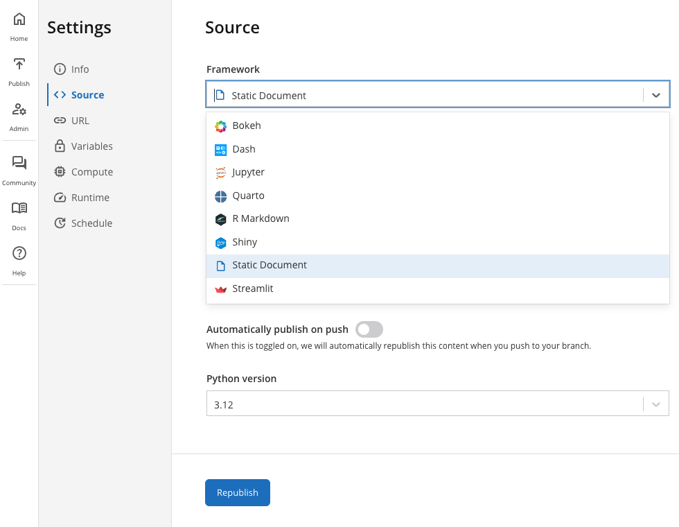 Once you are at the document’s settings, you can click the Source navigation menu item and change the Framework from Quarto to Static. To save those changes you have to click the Republish button at the bottom of the screen.